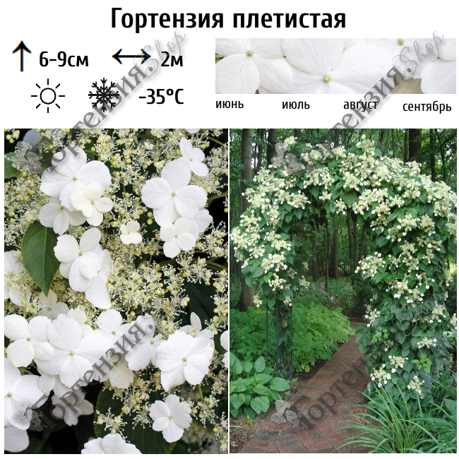 Замечательное растение для теневой стороны построек и деревьев, очень мощная лиана длиной до 6-9 м, но в первые год-два растёт медленно и нуждается в подпорках, затем прикрепляется к опоре сама воздушными корнями и присосками, без опоры стелется по земле, соцветия кремово-белые, диаметром 15-20 см, листья глянцевые, ярко-зелёные на длинных черешках.