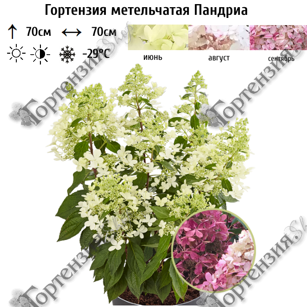 Гортензия метельчатая ‘Пандриа’ - эксклюзивная серия патио немецкой селекции PAN. Красивая малышка отличается очень скромными размерами: высота и ширина не превышают 70 см., Стебли прямые, крепкие, не разваливаются и не гнутся под тяжестью крупных, до 20 см, плотных соцветий, которых во время цветения зеленой листвы почти не видно. Соцветия кружевные, конические, лимонно-белого, а к осени приобретают роскошный темно-розовый цвет. Крепкий, компактный, шарообразный куст идеален для контейнерных и бордюрных посадок. Ароматный сорт! Насладиться всей палитрой красок можно с июня по октябрь.