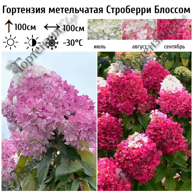 Гортензия метельчатая Строберри Блоссом (Strawberry Blossom) - напоминают клубнику, поэтому ее называют «клубничным цветением». Зацветает сливочно-белым цветом, затем розовеет и в полном роспуске становится малиновой. При этом кончик все время остается белым. Окончание конуса слегка заужено и белый кончик смотрится очень задорно. Аромат будет радовать до самых морозов. Куст вырастает в высоту до 100 см и имеет довольно крепкие побеги.