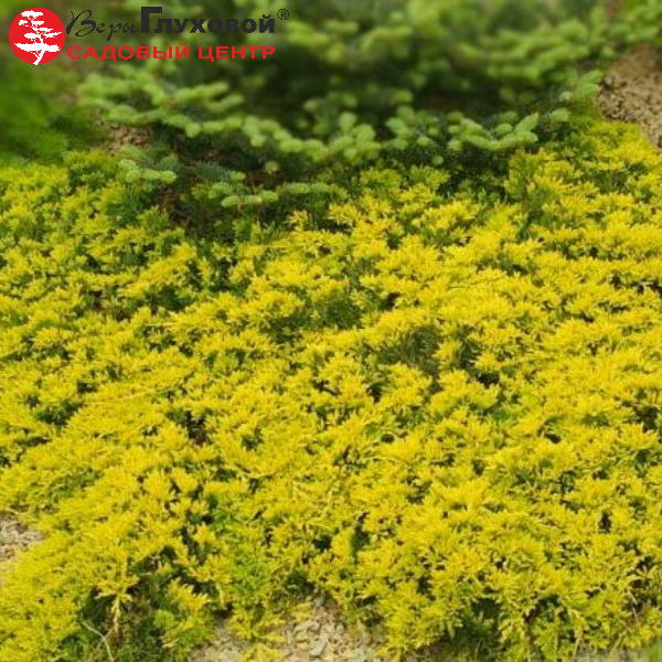 Можжевельник горизонтальный Голден Карпет (Juniperus horizontalis Golden Carpet) - популярный стелющийся сорт можжевельника с ярко-золотистой хвоей. Высота растения не превышает 15 см, и диаметр кроны 2 м. Растет медленно, по 10 см в год. Побеги длинные стелющиеся сверху покрыты золотистой, чешуйчатой, мелкой хвоей, снизу желто-зеленой, покрывают землю словно ковром. Отлично подойдет для украшения альпинария, хвойных клумб, послужит ярким украшением для любой композиции. Любит солнечные места, в тени золотистая окраска тускнеет. К плодородию почвы нетребователен, однако самые хорошие условия для можжевельника – это легкие, умеренно влажные, хорошо дренированные почвы с реакцией от слабокислой до щелочной. Зимостоек. Устойчив к городским условиям.
