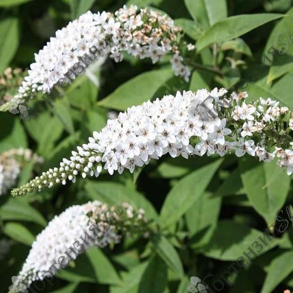 Буддлея Давида Уайт Профьюжн декоративный раскидистый с поникающими на концах ветвями. кустарник.  Листья темно-зеленые овально-ланцетные опушенные.  Цветет с июля по октябрь, цветки белые, собранные в   колосовидные метелки длиной по 30 см, очень ароматный кустарник, медонос. Почвы предпочитает плодородные дренированные. Применяется в живой изгороди, рокариях, альпийских горках, групповых посадках. Надземная часть побегов обмерзает, но в следующий вегетационный период восстанавливается. Нуждается в укрытии. Морозостойкость -23С.