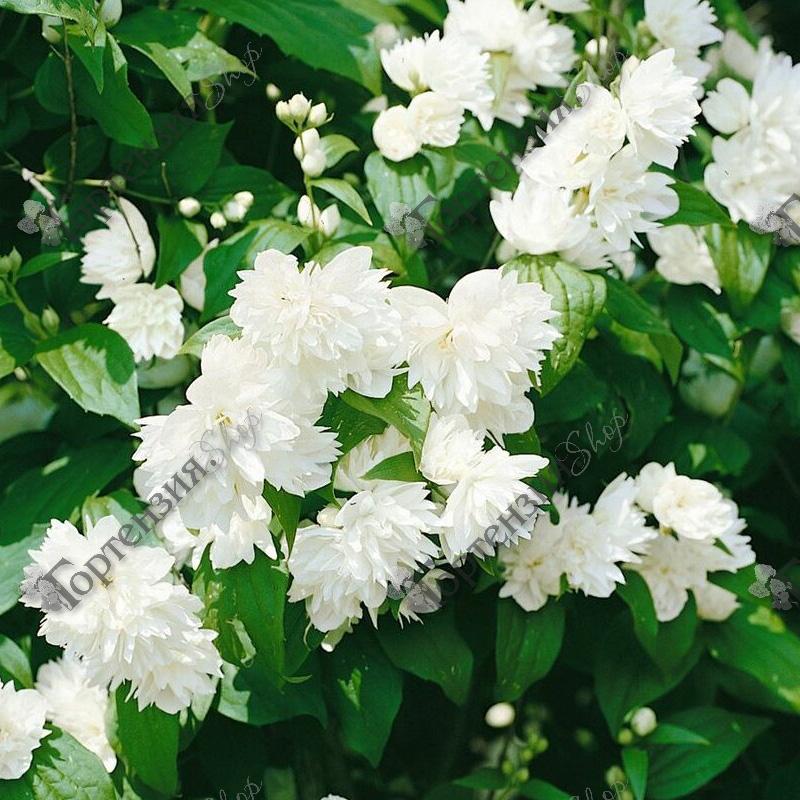 Чубушник (жасмин садовый) Schneesturm махровый Чубушник Шнеештурм (Schneesturm) - крупный красивоцветущий сорт чубушника, высотой и диаметром около 250 см. Крона раскидистая. Ветви дугообразно изогнуты. Цветет махровыми цветками до 5 см в диаметре, в кистовидных соцветиях по 5-7 шт.