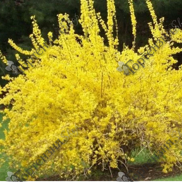 Форзиция средняя Голдзаубер (Forsythia intermedia Goldzauber) – ценится за раннее цветение, неприхотливость в выращивании и высокую декоративность. Среднерослый раскидистый кустарник с тонкими побегами высотой до 2 м. Листья длиной до 10 см, ланцетовидные, зубчатые, темно-зеленые, с нижней стороны светлее. Осенью приобретают темно-красный цвет. Цветёт крупными цветками насыщенной золотисто-жёлтой окраски апрель -  начало мая. Цветки в виде колокольчиков с 4 лепестками, ярко-желтые, располагаются кучно по 2-6 шт. на цветоножке.