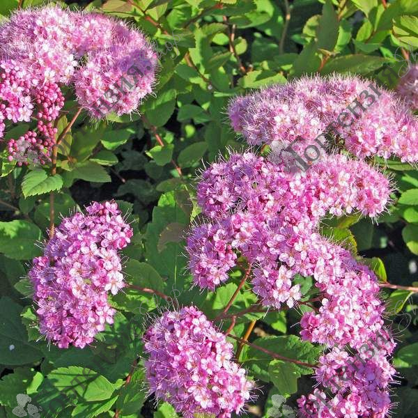 Спирея японская 'Odensala' Spiraea japonica Odensala Плотный густой кустарник с округлой кроной высотой и диаметром до 1 м. Листья крупные, сизовато-зелёные, осенняя окраска красивая, красно-коричневая. Побеги прямые, прочные, жёсткие, тёмно-бордовые. Цветки розовые, собраны в крупные щитковидные соцветия (VI–VІІ).