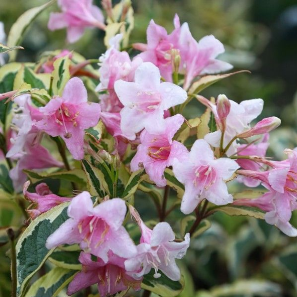 Вейгела цветущая  'Вариегата'Weigela florida' Variegata' - красивоцветущий,широкораскидистый  кустарник высотой до 150 см,Листья зеленые с белой каймой.Цветки разных оттенков: от белоснежного до розового,напоминают вытянутые колокольчики .Цветёт в мае-июне на прошлогодних побегах, любит плодородную почву и ежегодную обрезку после цветения, на зиму ветки пригибают к земле.