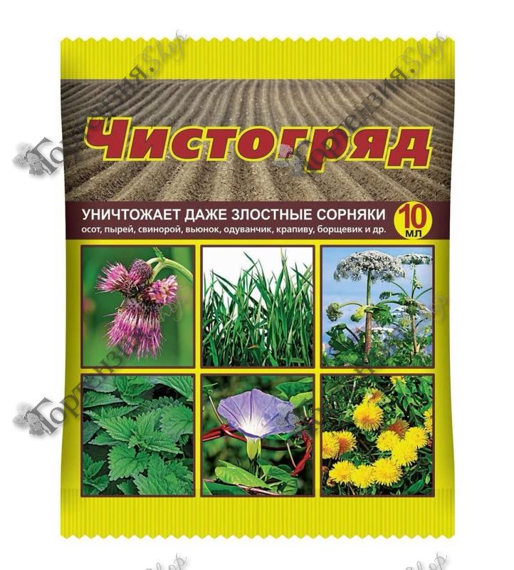Гербицид Чистогряд для уничтожения и для быстрого удаления двудольных и злаковых сорняков, как однолетних, так и многолетних. Спустя 3 недели сорные травы полностью погибают и иссушаются. Сроки выхода для проведения ручных работ составляет 3 дня. Препарат одновременно сочетает в себе свойства гербицида и десиканта (обезвоживает сорняки). Проникая внутрь растения, это вещество нарушает метаболизм сорных трав, задерживая ферментный синтез аминокислот. Обработку следует производить из пульверизатора по листу (либо при помощи кисточки), так как корни не будут в достаточном количестве впитывать отраву.