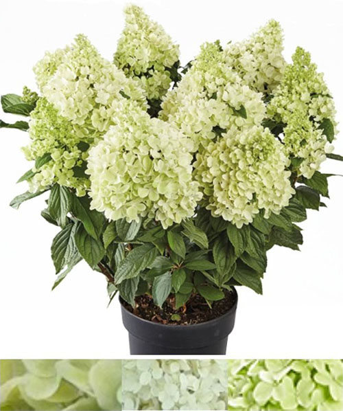 Метельчатая гортензия "Панорама" – эксклюзивная серия Патио немецкой селекции PAN, отличается невысокой, компактной формой куста, высотой до 100 см, рано зацветает и обильно цветет, неприхотлив в уходе. Соцветия плотные, конусовидные, в начале цветения нежно-зелёного цвета, затем белые, к осени приобретают лаймовый оттенок. На солнечном участке или в легкой полутени цветение будет пышнее и ярче. Ветви крепкие, прямостоячие. Цветет с июня по сентябрь. Почва кислая, влажная, но без застоя воды. Зимостоек, неприхотлив. Прекрасно смотрится как бордюрное растение, так можно выращивать и в кашпо.